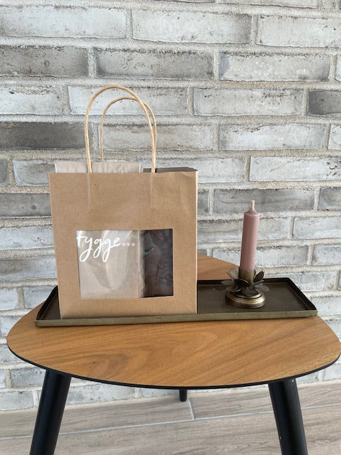 Gavepakke - 2 str. bloklys (H15 og H10), bedelys og hyggeservietter i farven hør samt stage til en genbrugsflaske. Gavepose medfølger