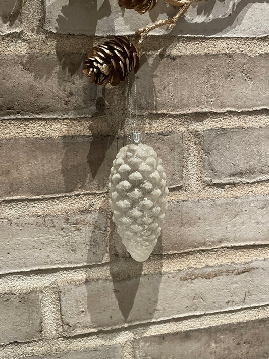 Julekugle glas - kogle hvid frosted