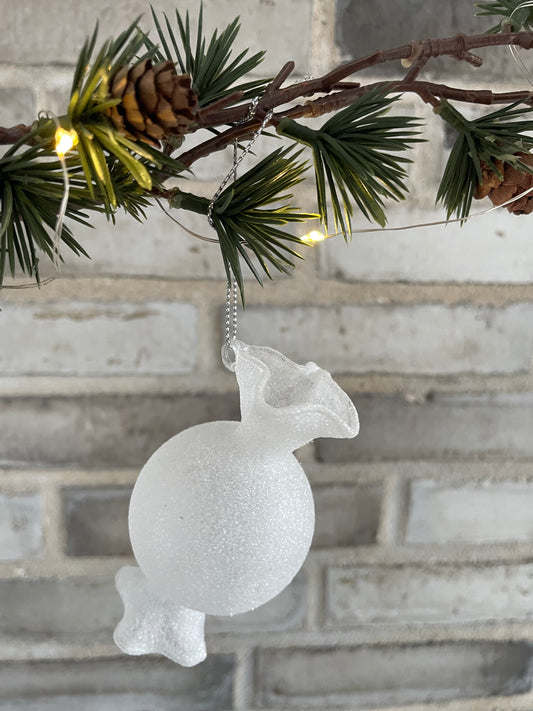 Julekugle i glas - bonbon frosted hvid